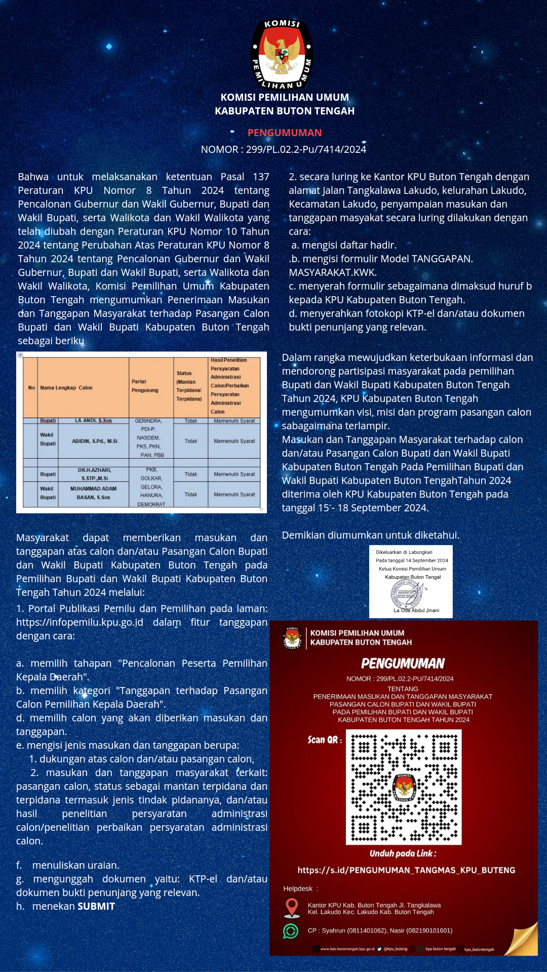"Apabila masyarakat ingin menyampaikan tanggapan, bisa melalui situs KPU yakni infopemilu.kpu.go.id pada fitur tanggapan dan atau datang langsung ke kantor KPU Buteng," jelas Darwin.