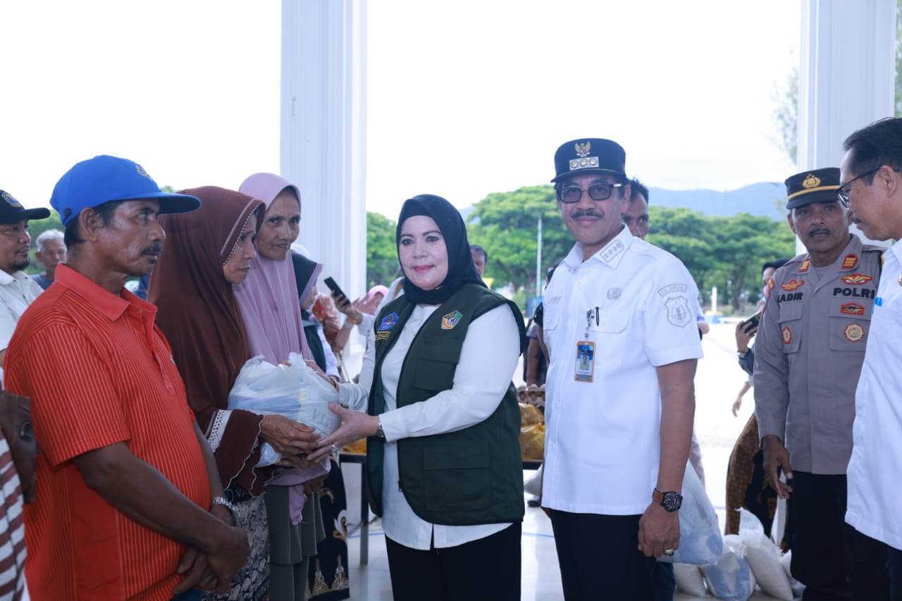 Kadis Perindag Sultra, Hj Sitti Saleha bersama Pj Bupati Bombana Edy Syharmanto saat menyerahakan paket sembako secara simbolis saat pasar murah di Kabupaten Bombana