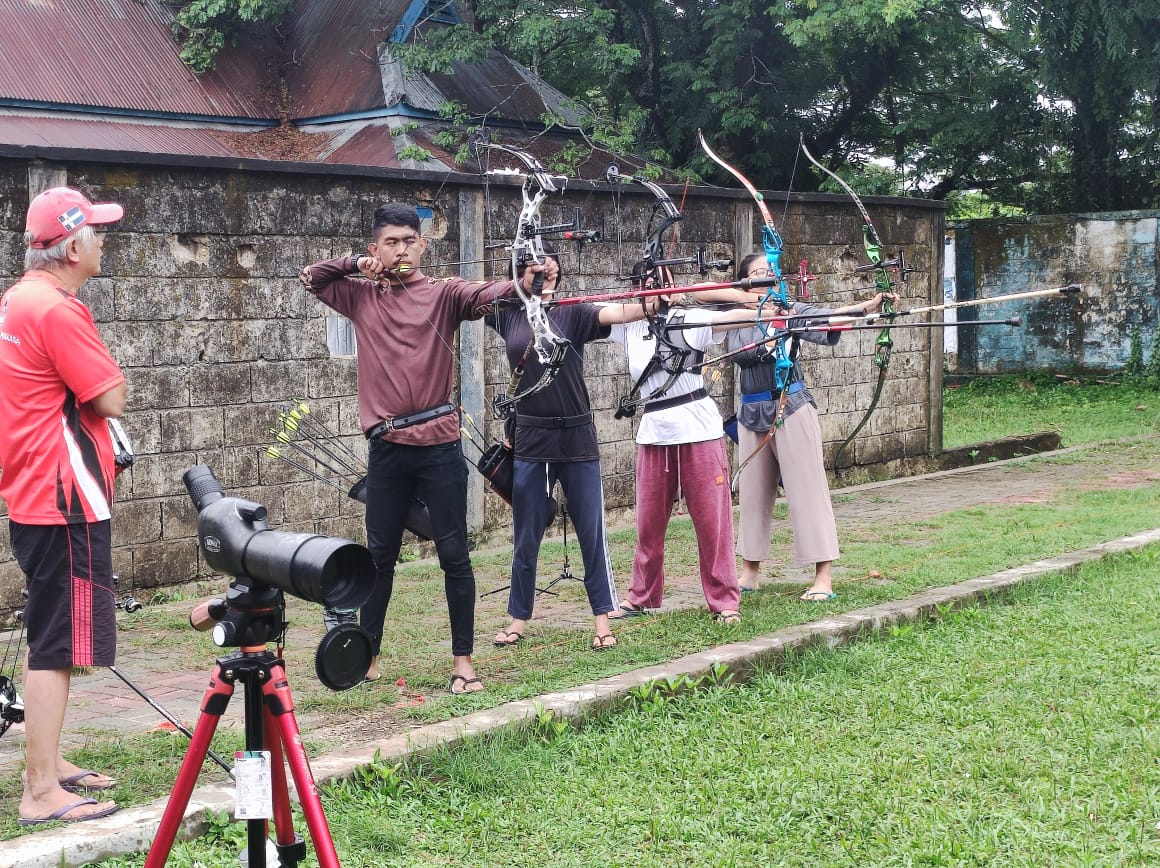 Pemanah Sulawesi Utara didampingi pelatih Stenly (kostum merah) menjalani sesi latihan di Kendari
